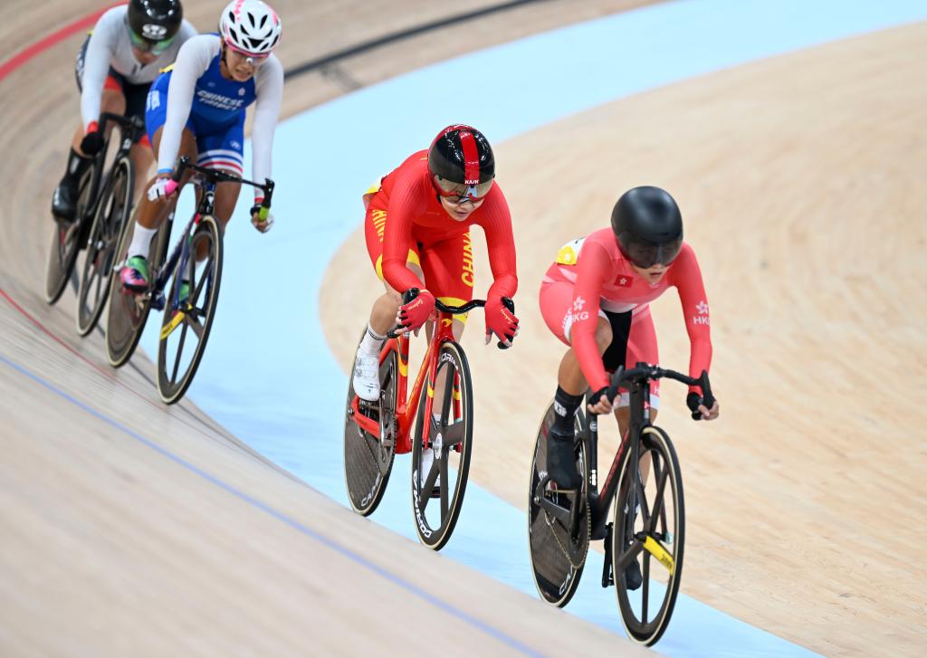 2023年9月29日,中国选手刘佳丽(右二)、中国香港选手李思颖(右一)在女子全能赛冲刺赛的比赛中。当日,在杭州亚运会场地自行车女子全能赛决赛中,日本选手梶原悠末夺得冠军,中国香港选手李思颖获得亚军,中国选手刘佳丽获得季军。新华社记者 胡虎虎 摄