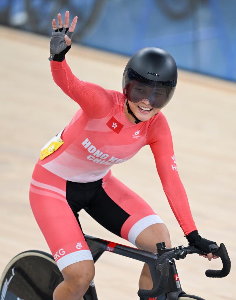 2023年9月29日,中国香港选手李思颖在比赛后向现场观众致意。当日,在杭州亚运会场地自行车女子全能赛决赛中,中国香港选手李思颖获得亚军。新华社记者 胡虎虎 摄
