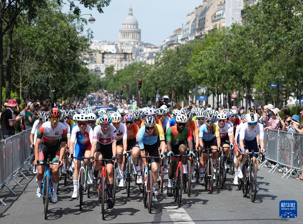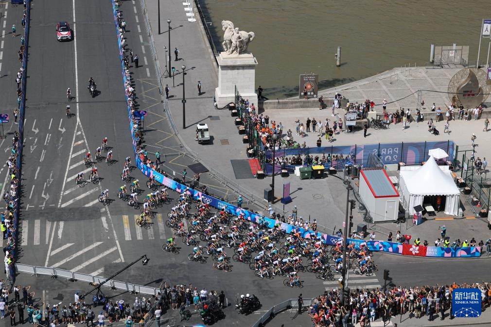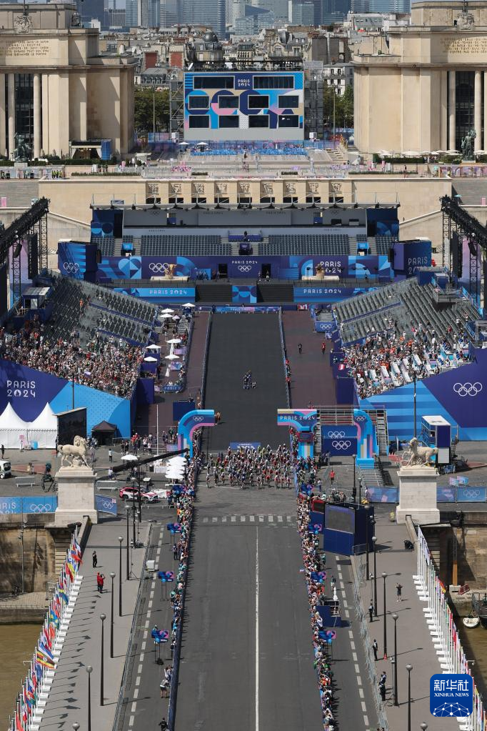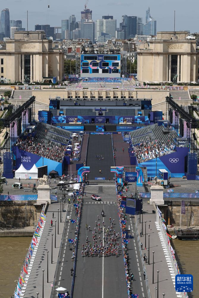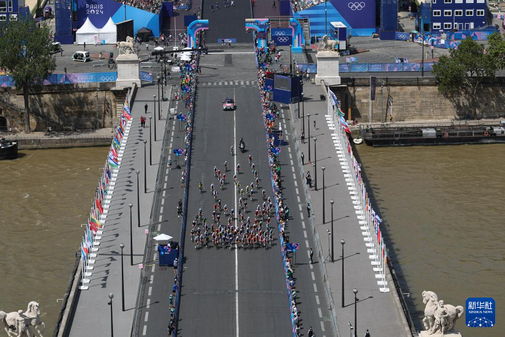 8月4日,参赛选手从巴黎奥运会冠军广场起点处出发,经过塞纳河耶拿桥。