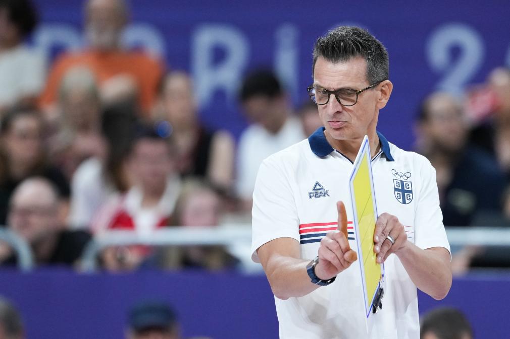 7月31日,塞尔维亚队主教练古德蒂在比赛中给队员布置战术。新华社记者 鞠焕宗 摄