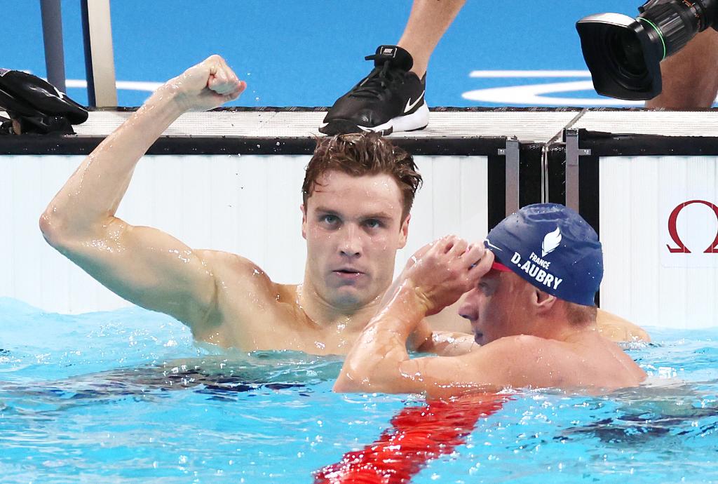 8月4日,中国队选手潘展乐(中)在夺冠后庆祝。新华社记者 王鹏 摄