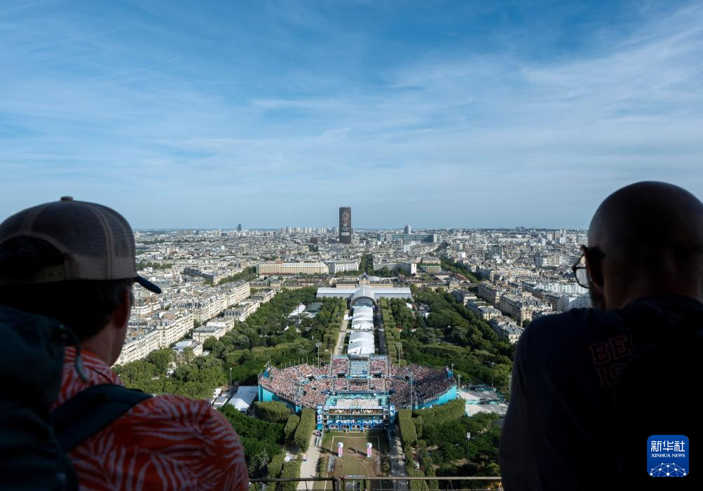 8月4日,观众在埃菲尔铁塔上观赛。