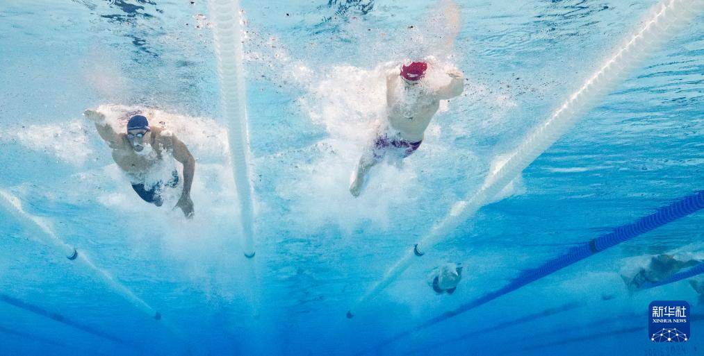 8月4日,中国队第四棒选手潘展乐(右)在最后阶段冲刺。