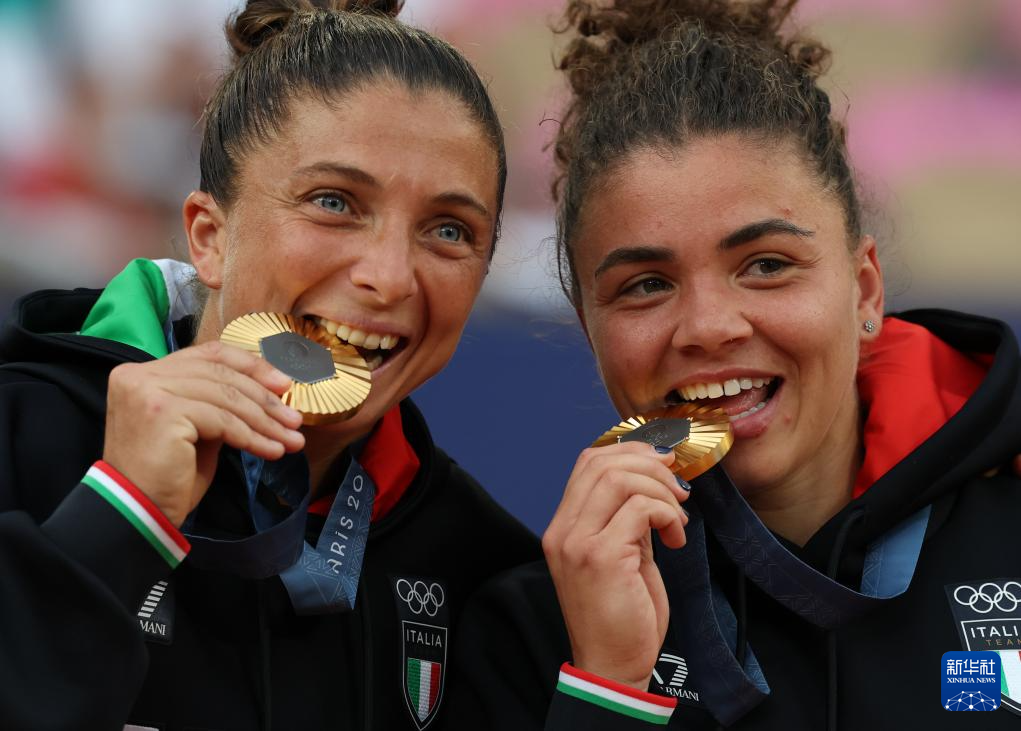 8月4日,意大利组合埃拉尼(左)/保利尼在颁奖仪式上庆祝。
