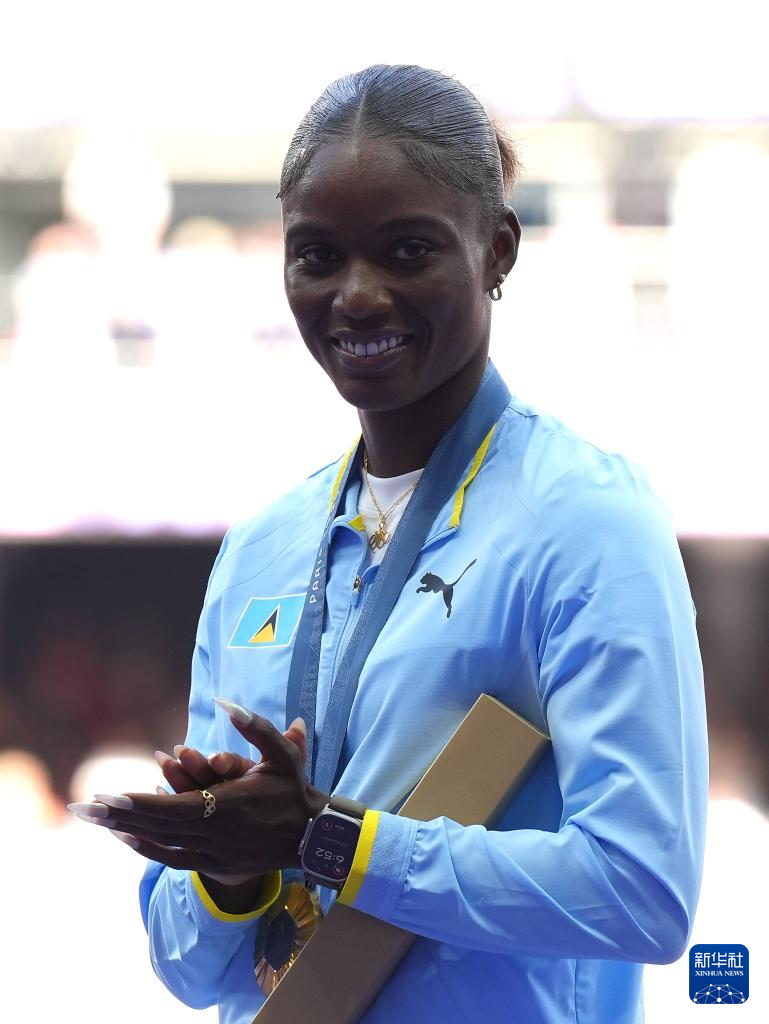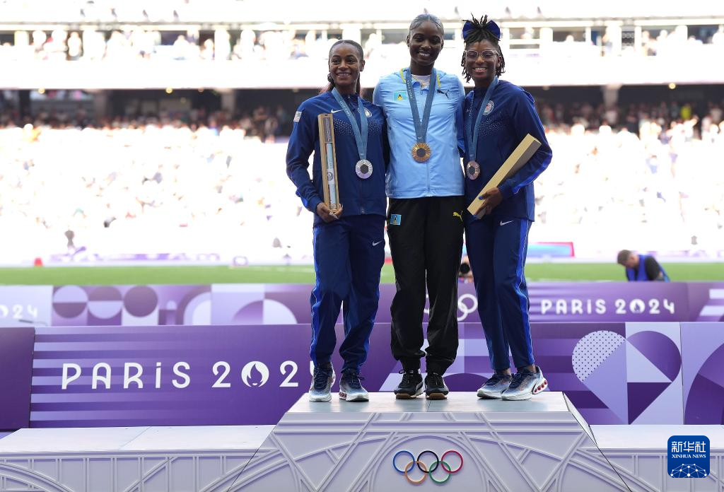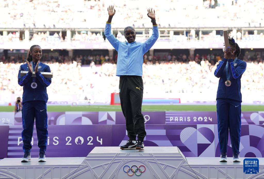 当日,巴黎奥运会田径女子100米颁奖仪式在法兰西体育场举行。