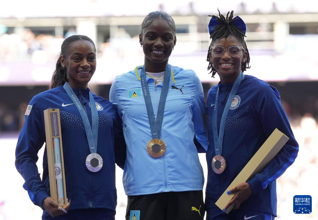 8月4日,冠军圣卢西亚选手阿尔弗雷德(中)、亚军美国选手理查德森(左)、季军美国选手杰斐逊在颁奖仪式上。