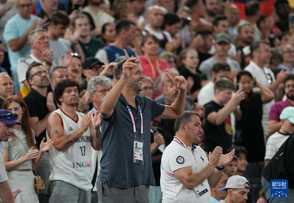 8月6日,德国篮球名宿诺维茨基(前)庆祝德国队获胜。新华社记者 孟永民 摄
