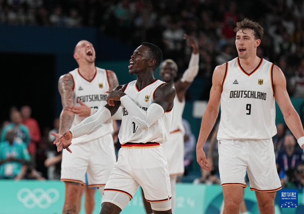 8月6日,德国队球员邦加(前左)在比赛中投中关键三分球后庆祝。新华社记者 孟永民 摄