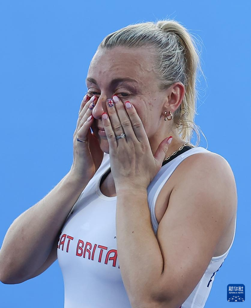 8月5日,英国队球员弗伦奇在赛后擦拭泪水。