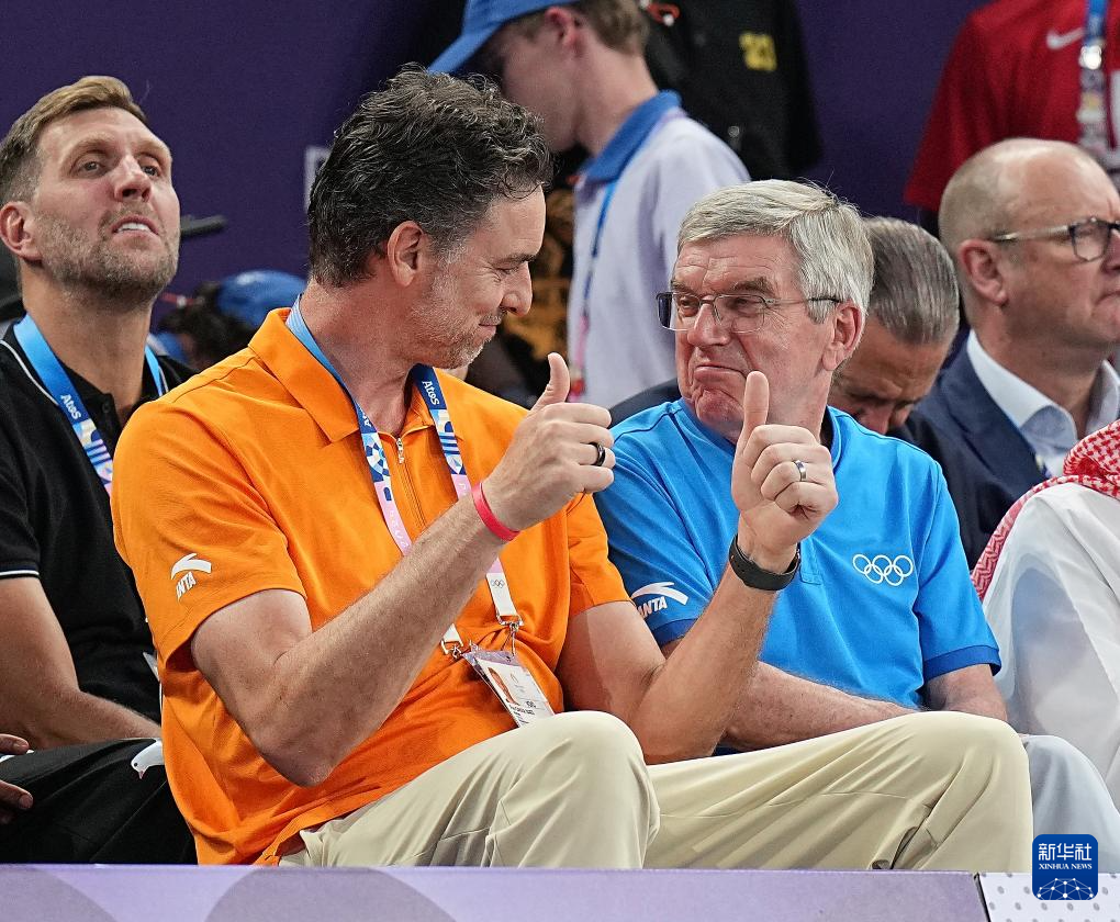 8月5日,国际奥委会主席巴赫(右)与国际奥委会运动员委员会委员保罗·加索尔在场边观赛。
