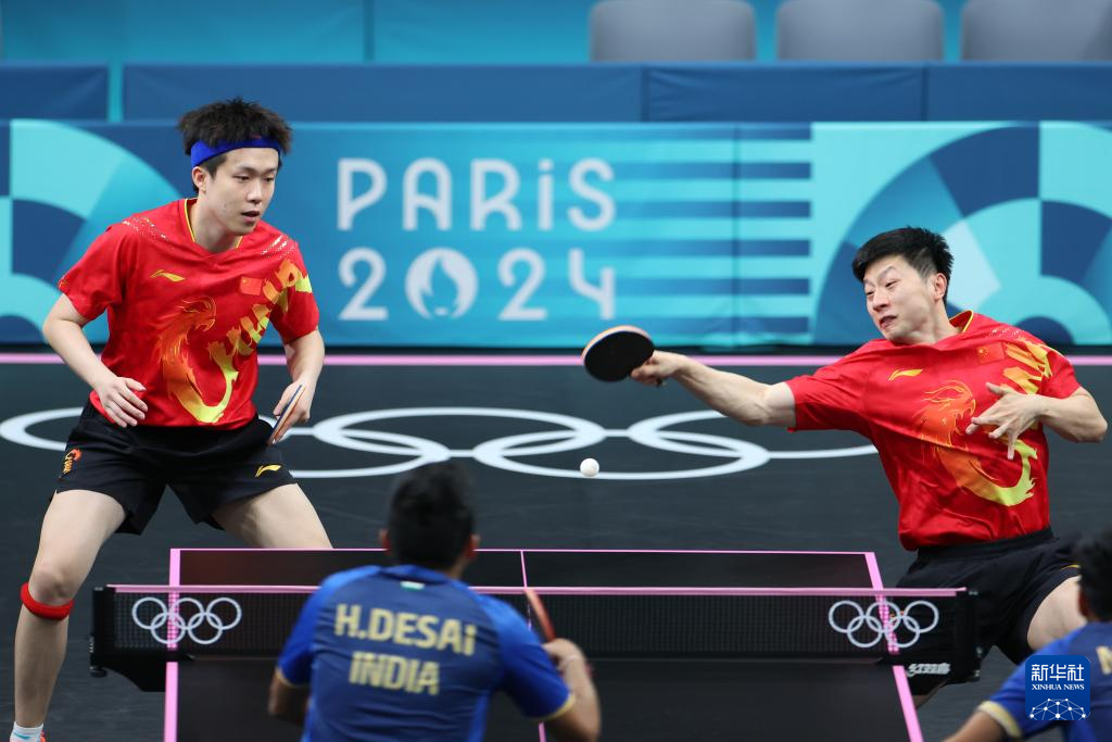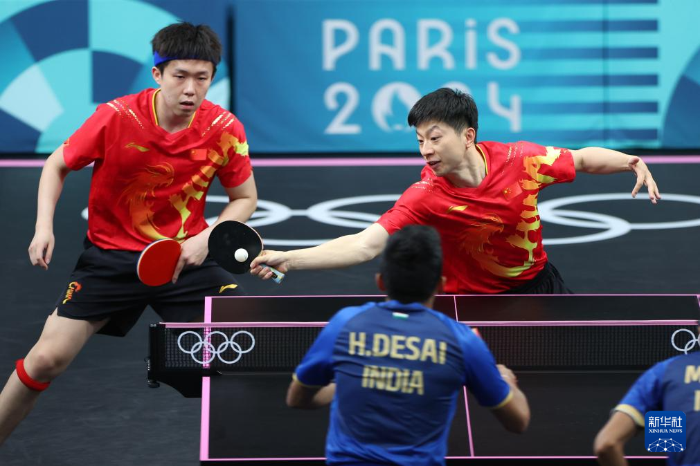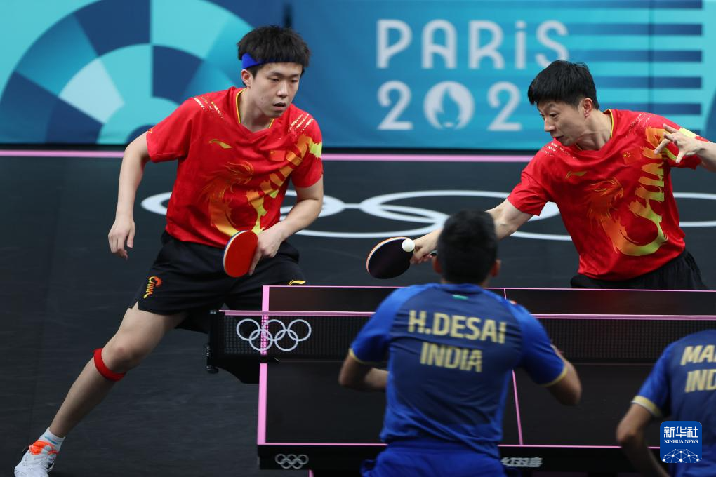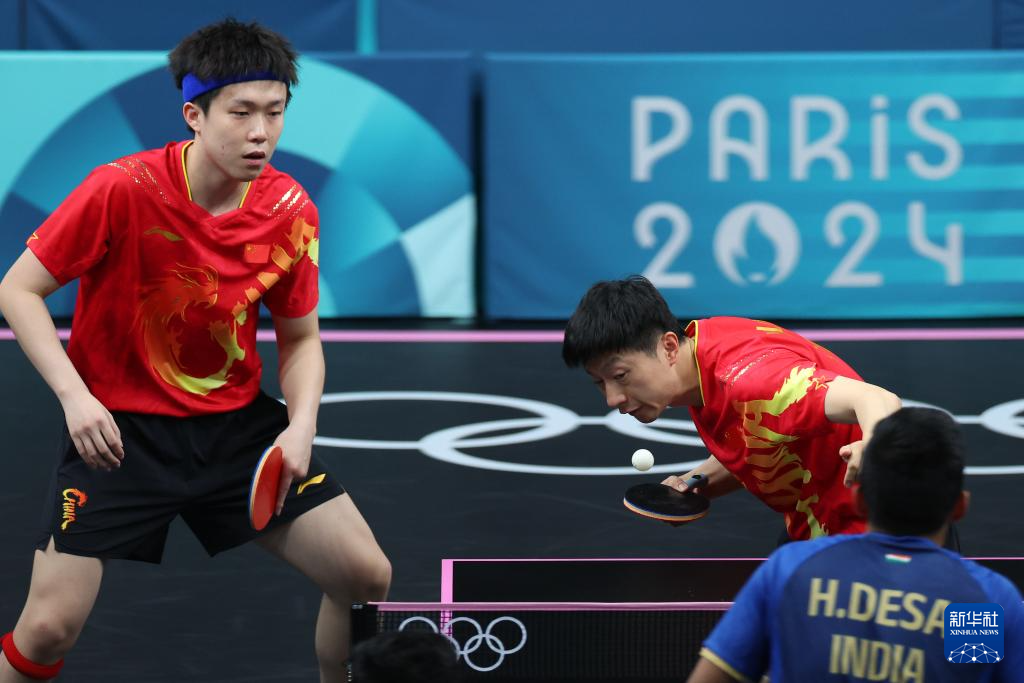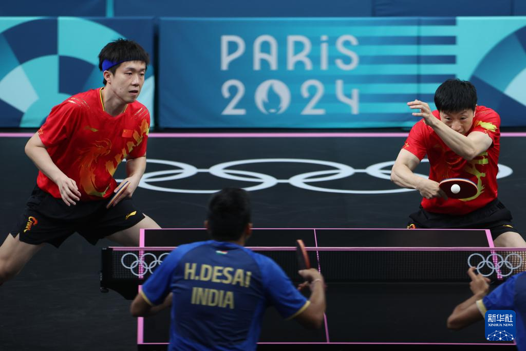 8月6日,中国组合马龙(上右)/王楚钦在比赛中。他们3比0战胜印度组合德塞/塔卡。新华社记者 刘续 摄