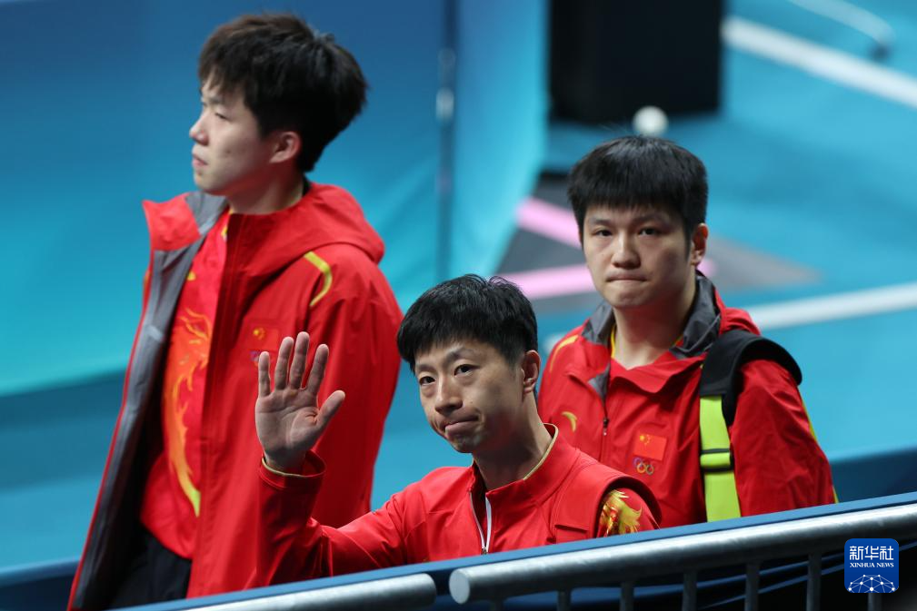 8月6日,中国队选手王楚钦、樊振东、马龙(从左至右)在赛后离场。新华社记者 刘续 摄