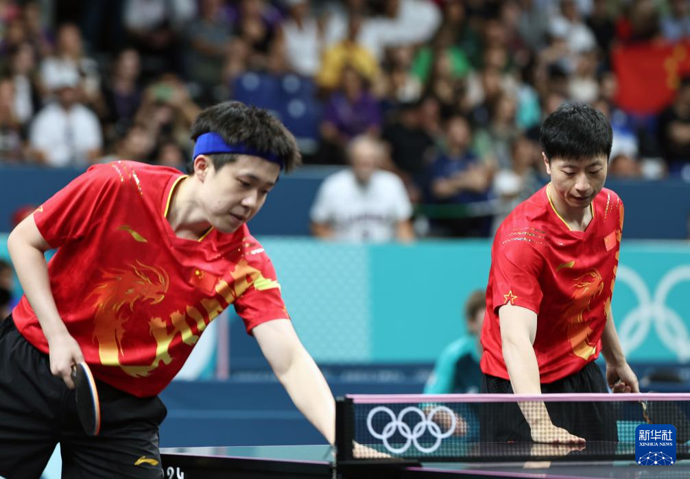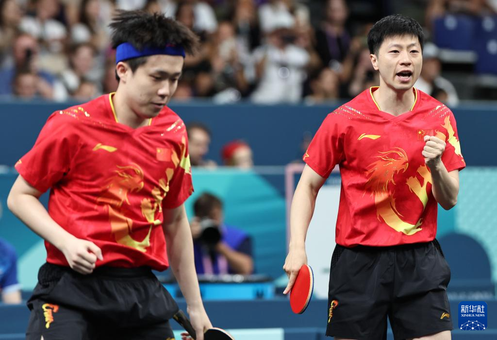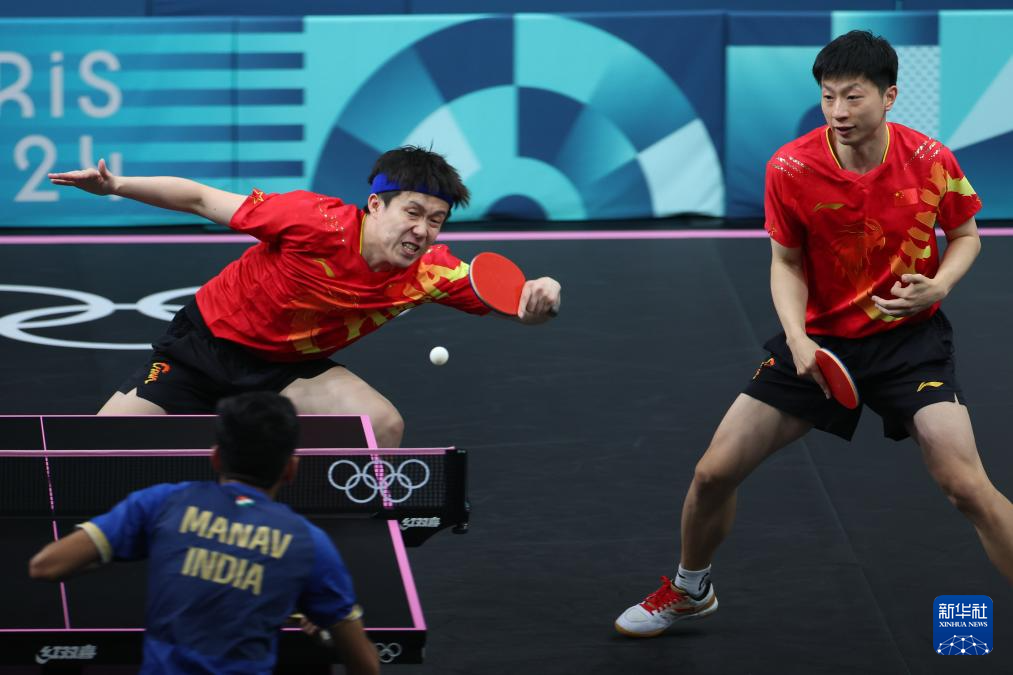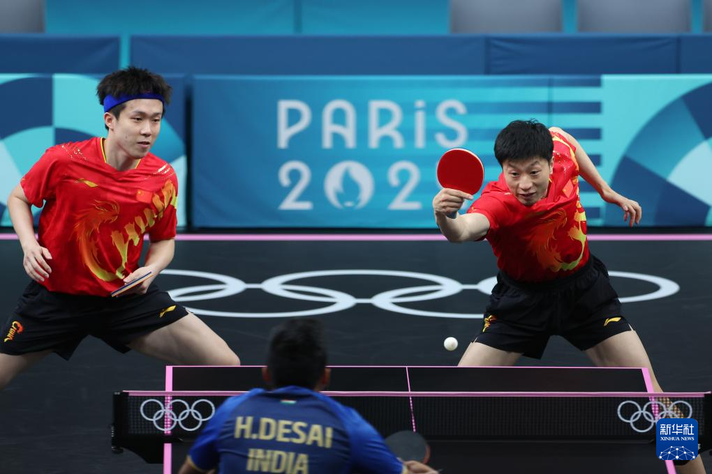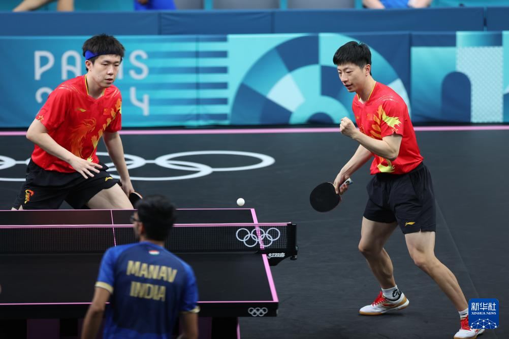 8月6日,中国队选手马龙(左)/王楚钦在比赛中。他们3比0战胜印度队选手德塞/塔卡。新华社记者 王东震 摄