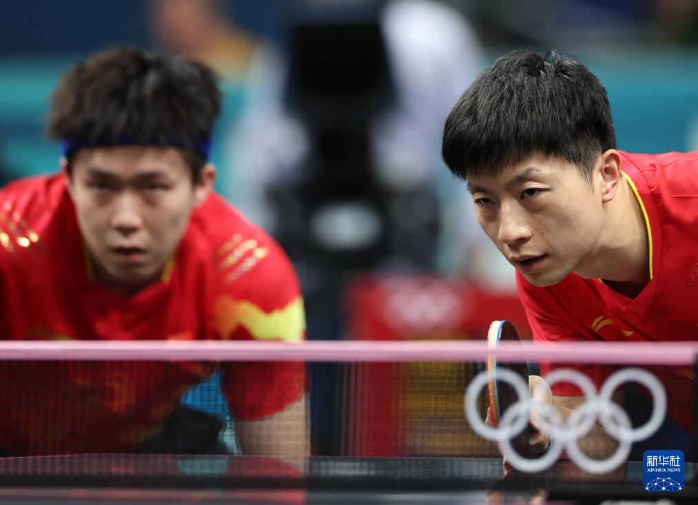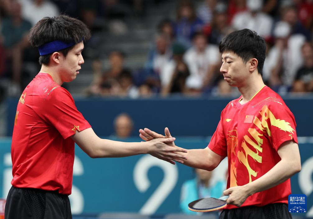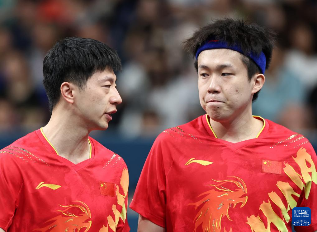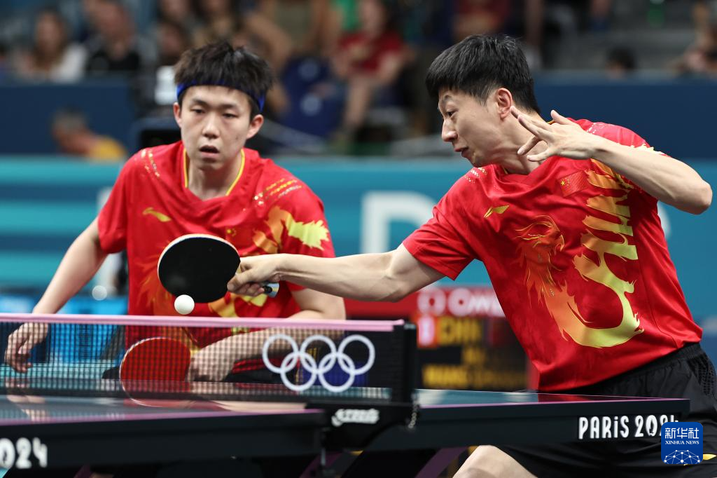 8月6日,中国队选手马龙(左)/王楚钦在比赛中。他们3比0战胜印度队选手德塞/塔卡。新华社记者 王东震 摄