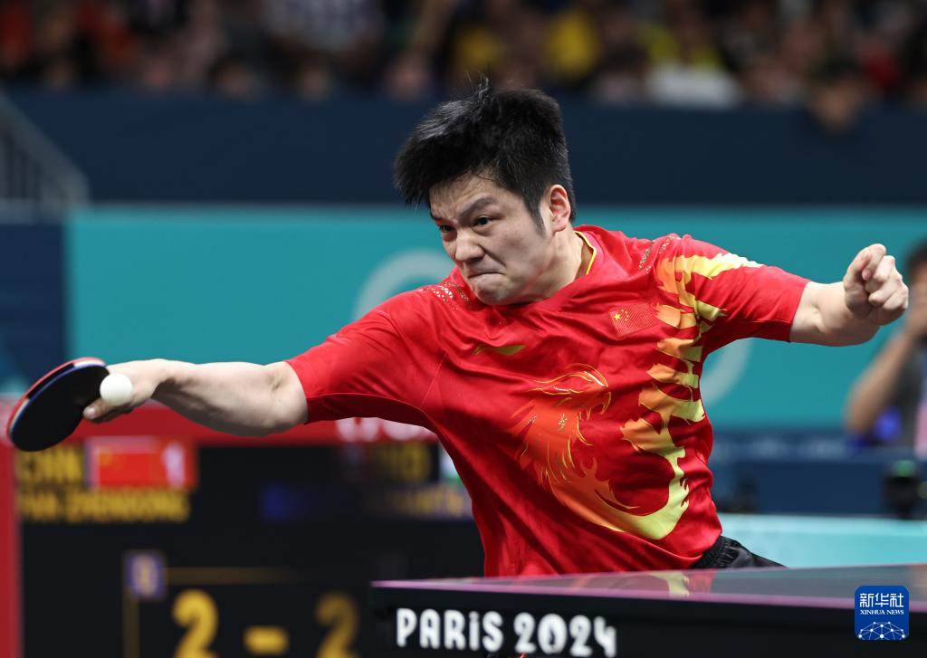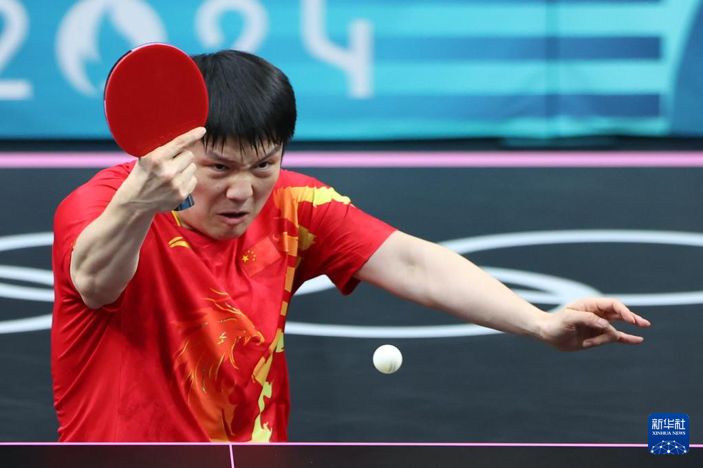 8月6日,中国队选手樊振东在比赛中。他3比1战胜印度选手阿昌塔。新华社记者 刘续 摄