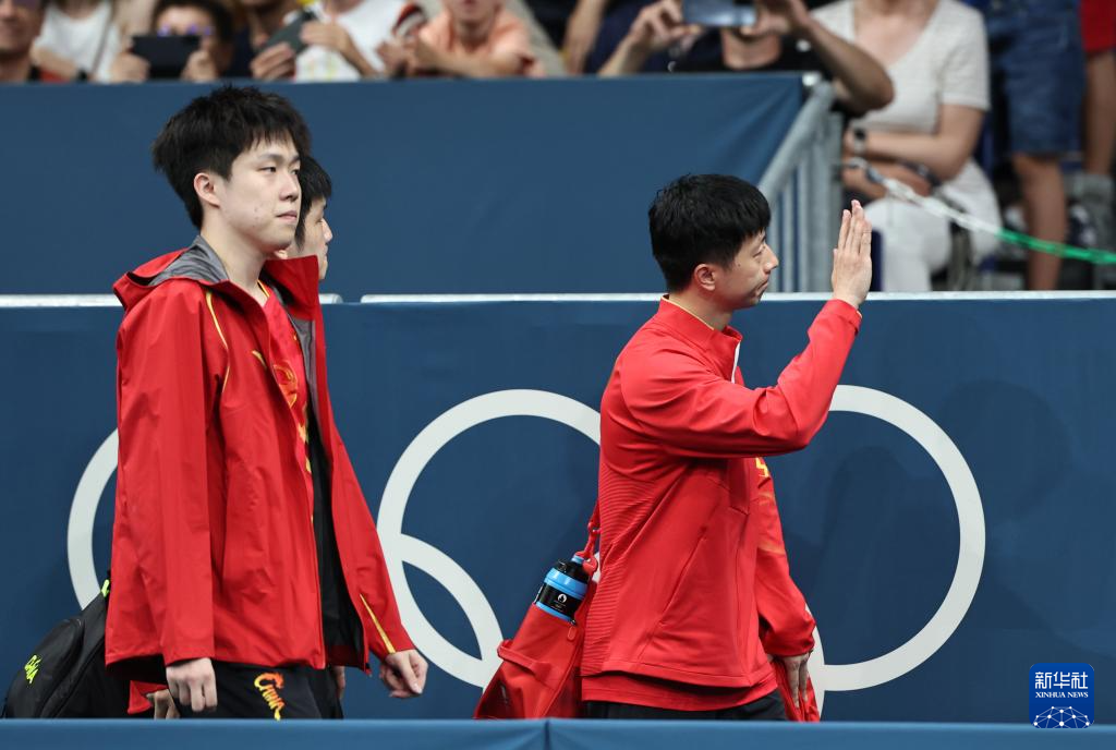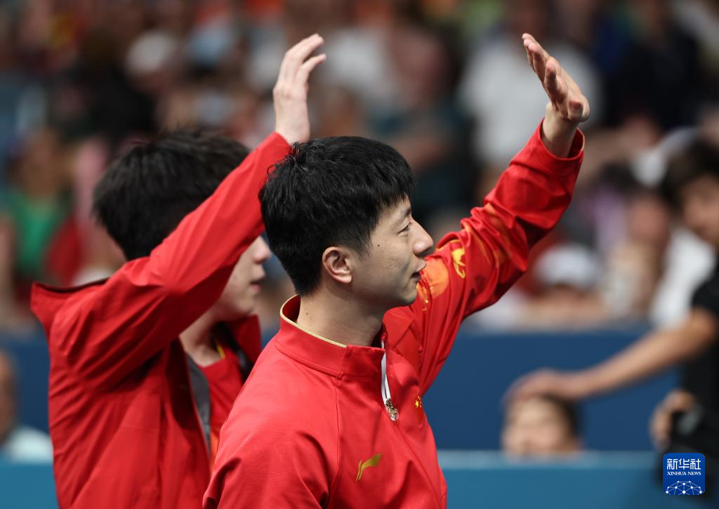8月6日,中国队选手马龙(右)和王楚钦在赛后向观众致意。新华社记者 王东震 摄