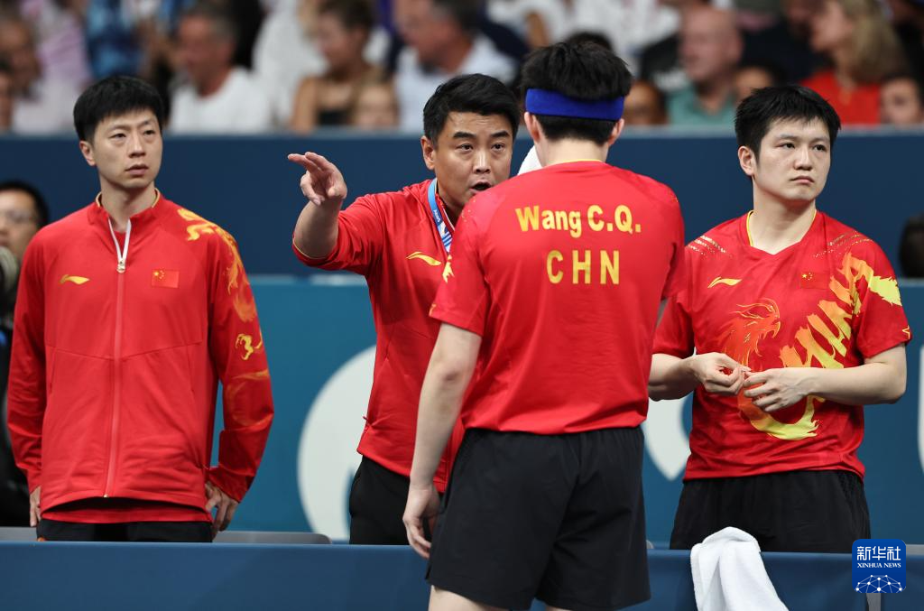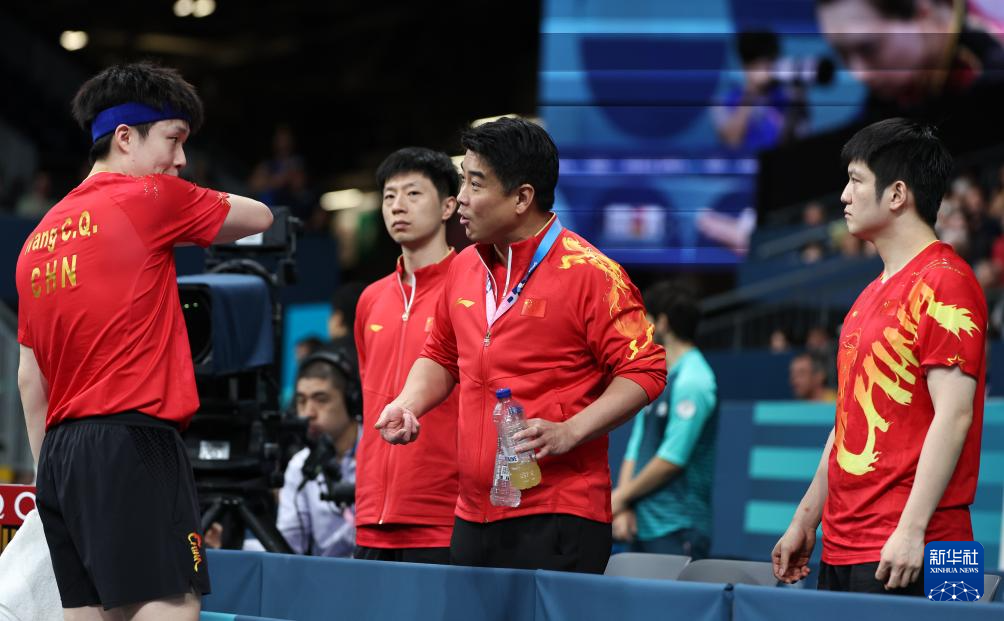 8月6日,教练王皓(左二)在比赛间隙指导王楚钦(右二)。新华社记者 王东震 摄