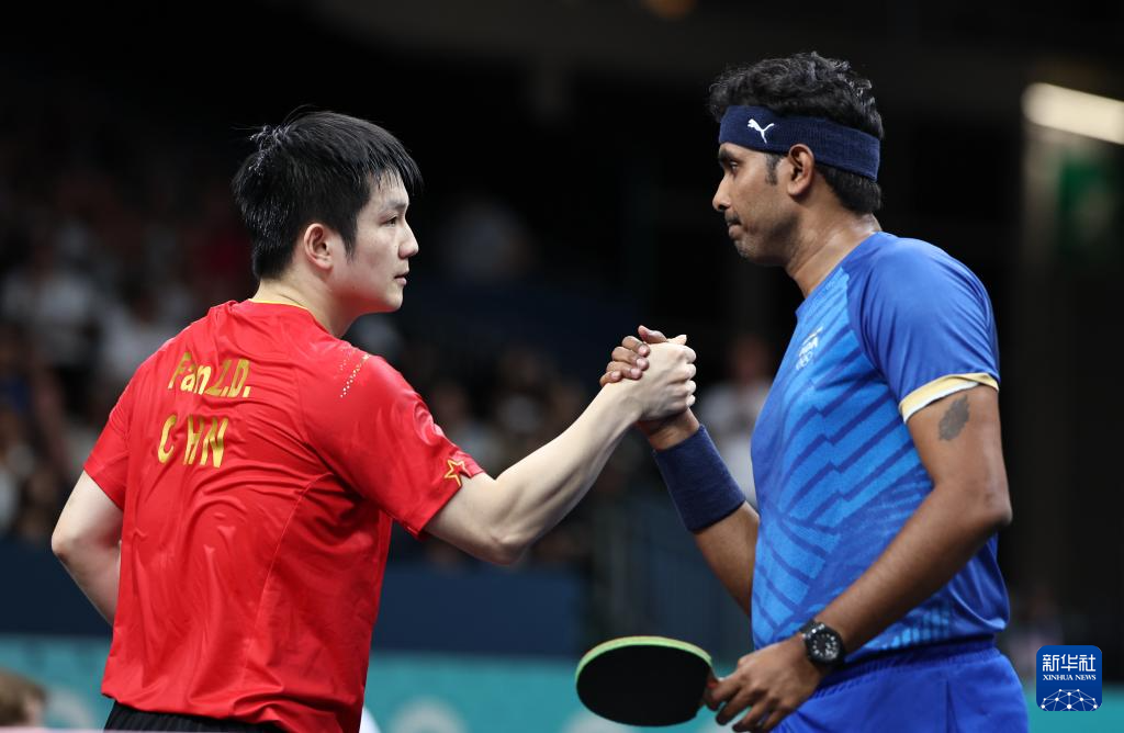8月6日,中国队选手樊振东(左)和印度队选手阿昌塔在比赛后握手致意。新华社记者 王东震 摄