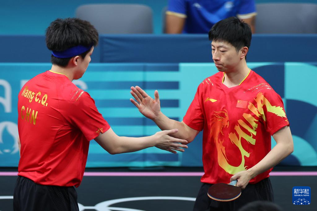 8月6日,中国组合马龙(右)/王楚钦在获胜后击掌。他们3比0战胜印度组合德塞/塔卡。新华社记者 刘续 摄