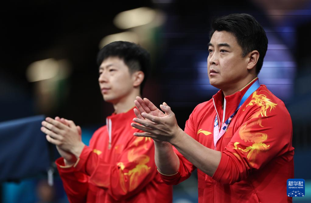 8月6日,中国队选手马龙(左)和教练王皓在场边观赛。新华社记者 王东震 摄