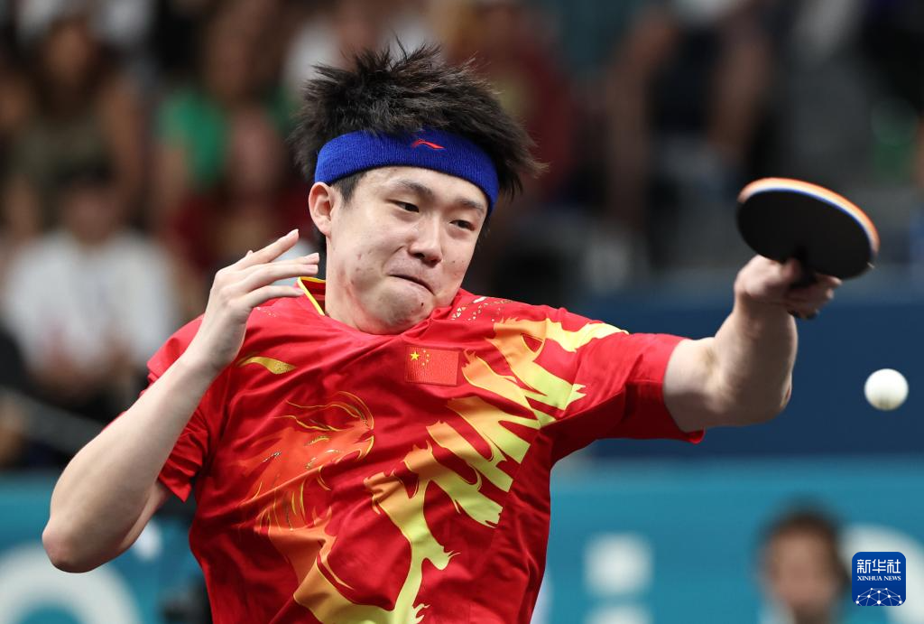 8月6日,中国队选手王楚钦在比赛中。他以3比0战胜印度选手塔卡。新华社记者 刘续 摄