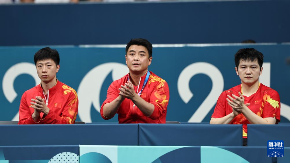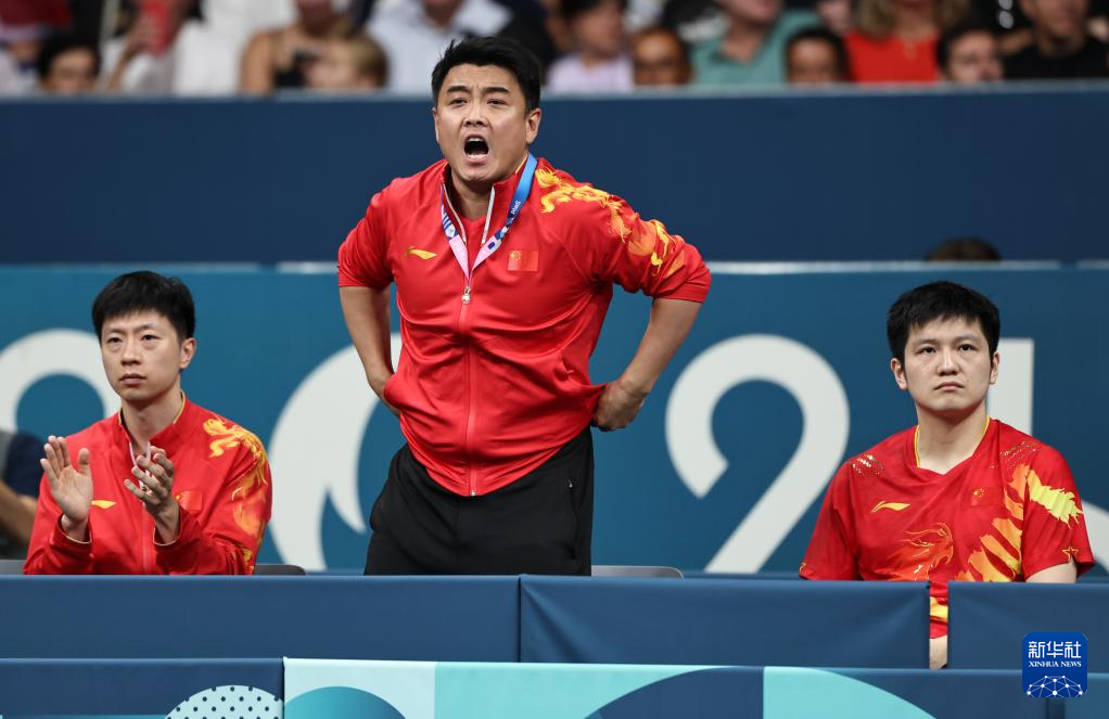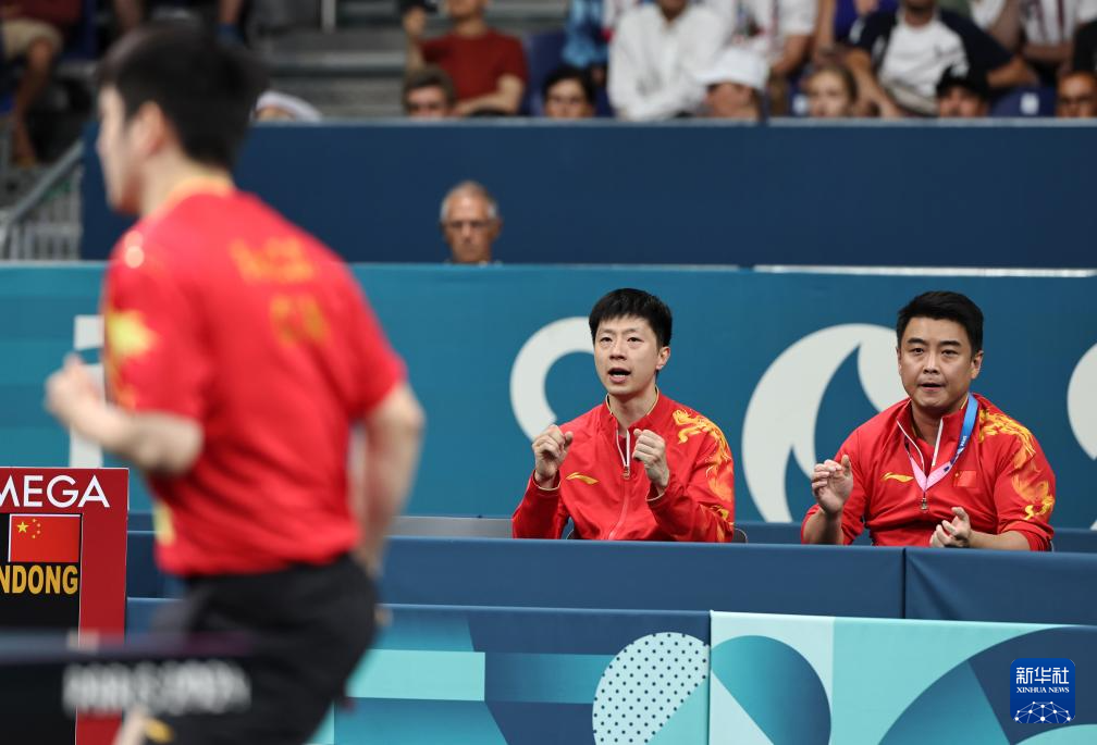 8月6日,中国队选手马龙(左)、樊振东(右)和教练王皓在场边观赛。新华社记者 王东震 摄