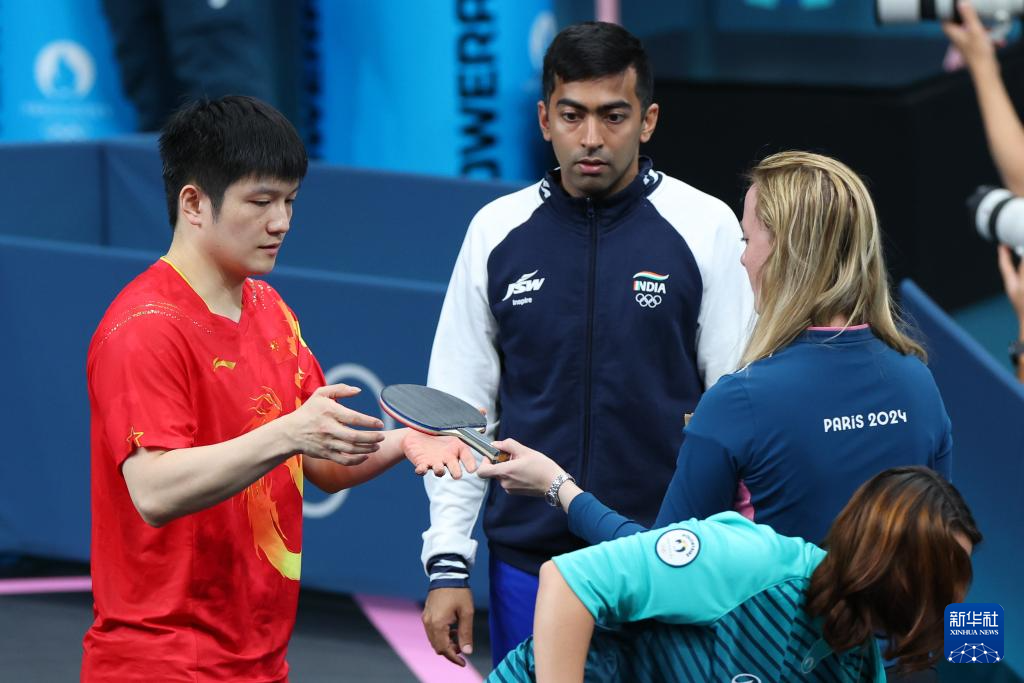 8月6日,裁判员在赛后向中国选手樊振东(左一)递交球拍。新华社记者 刘续 摄