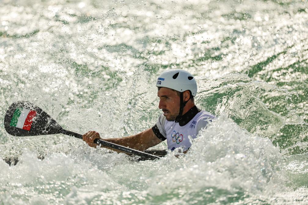 8月1日,冠军意大利选手德热纳罗在比赛中。当日,巴黎奥运会皮划艇激流回旋男子单人皮艇决赛举行。新华社记者 沈伯韩 摄
