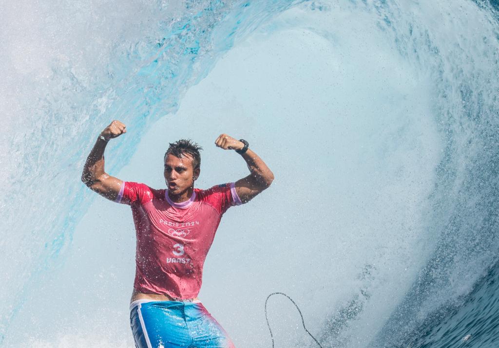 8月5日,法国选手瓦斯特在比赛中庆祝冲出管浪。新华社记者 马平 摄