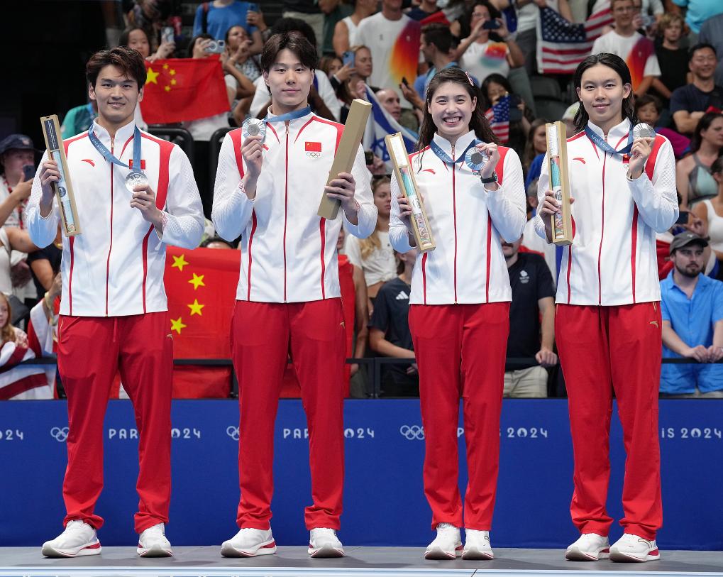 8月3日,亚军中国队选手杨浚瑄、张雨霏、覃海洋、徐嘉余(从右至左)在颁奖仪式上。中国队以3分37秒55的成绩获得男女4X100米混合泳接力亚军并打破亚洲纪录。新华社记者 杜宇 摄