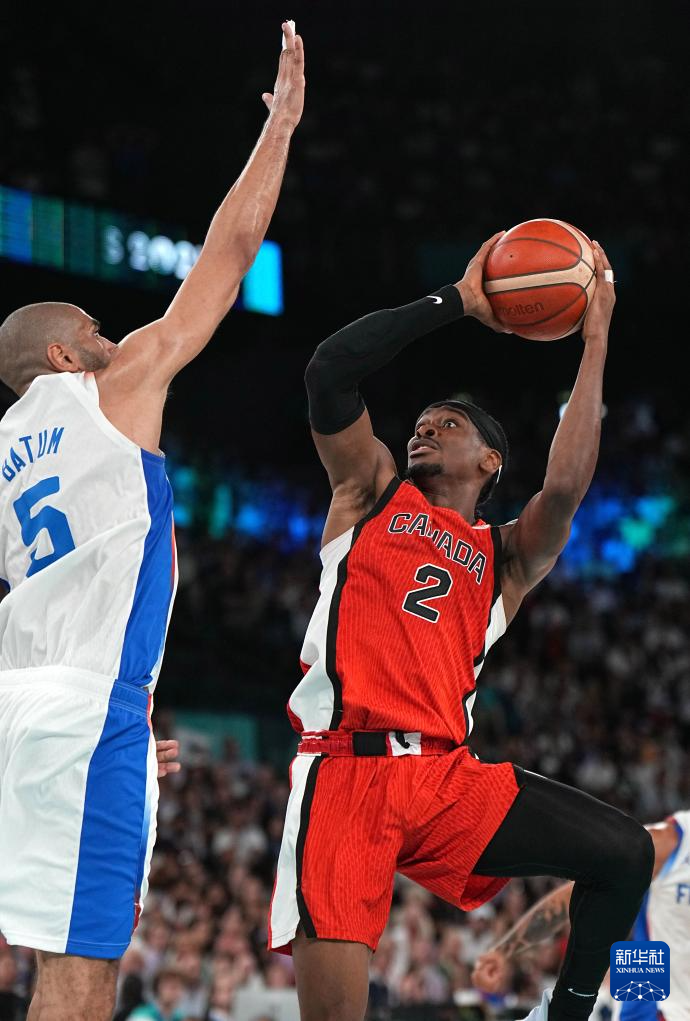 8月6日,加拿大队球员吉尔吉斯-亚历山大(右)在比赛中投篮。