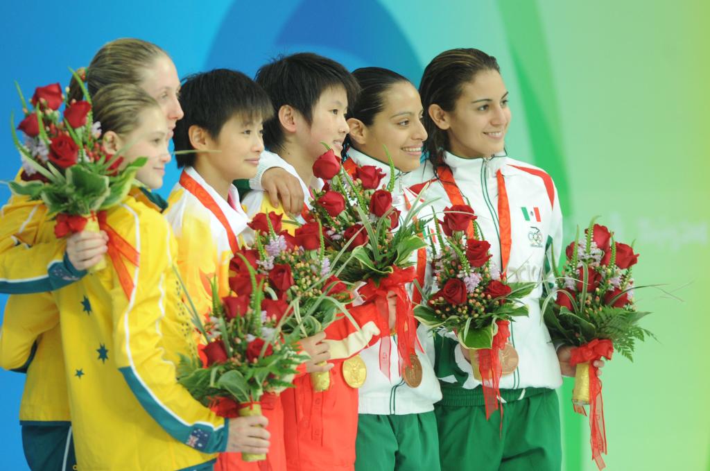 2008年8月12日,银牌得主澳大利亚选手布里奥妮·科尔(左二)/伍丽群(左一)、金牌得主中国选手陈若琳(右三)/王鑫(左三)和铜牌得主墨西哥选手葆拉·埃斯皮诺萨(右一)/塔蒂亚娜·奥尔蒂斯在颁奖仪式上合影。新华社记者 赵鹏 摄