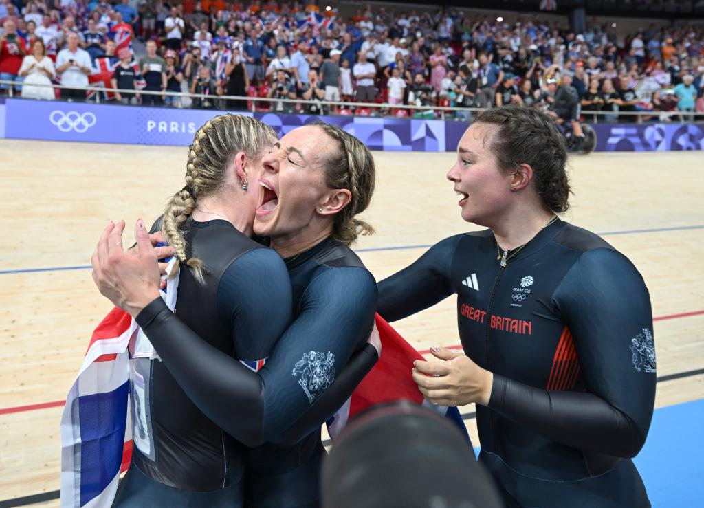 8月5日,英国队庆祝夺冠。当日,在巴黎奥运会场地自行车女子团体竞速赛中,英国队获得冠军,新西兰队获得亚军,德国队获得季军,中国队获得第六名。新华社记者 胡虎虎 摄