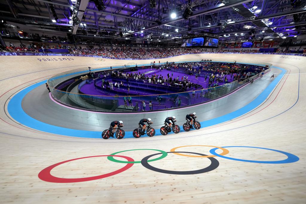 8月6日,英国队在比赛中。当日,在巴黎奥运会场地自行车男子团体竞速赛中,荷兰队、英国队、澳大利亚队分获前三名,中国队获得第七名。新华社记者 李一博 摄