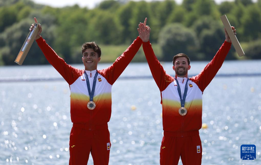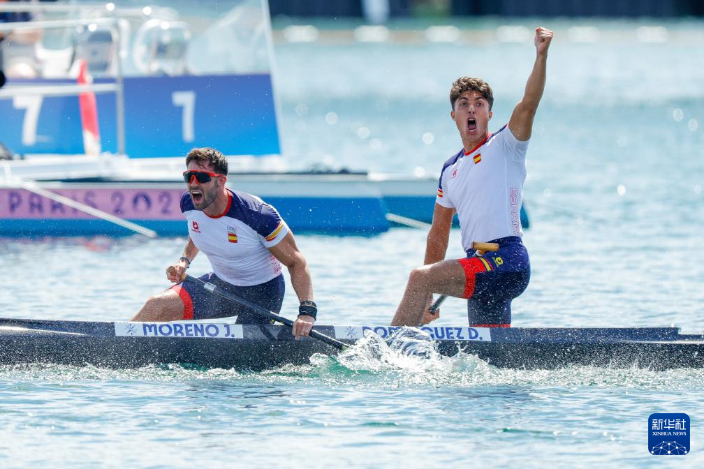 8月8日,西班牙选手莫雷诺(左)、多明格斯在比赛后庆祝。最终,他们获得季军。新华社记者 沈伯韩 摄