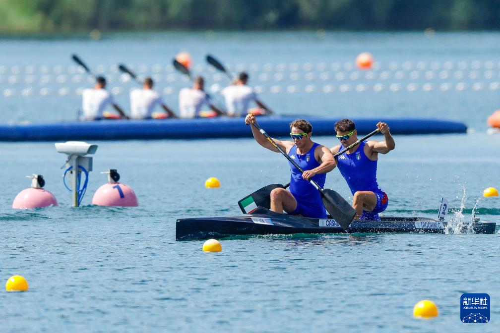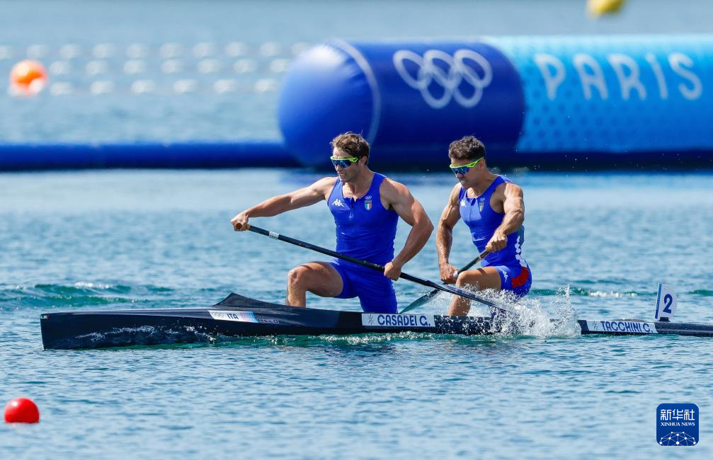 8月8日,意大利选手卡萨代伊(左)、塔基尼在比赛中。最终,他们获得亚军。新华社记者 沈伯韩 摄