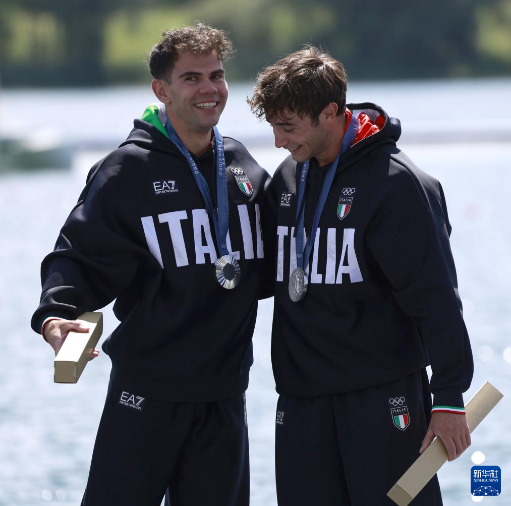 8月8日,亚军意大利选手卡萨代伊(右)、塔基尼在颁奖仪式上。新华社记者 任正来 摄