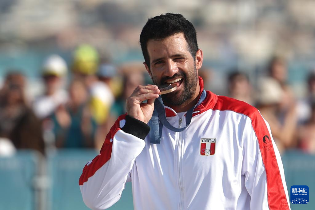 8月7日,秘鲁选手佩斯基耶拉在奖牌轮后庆祝。