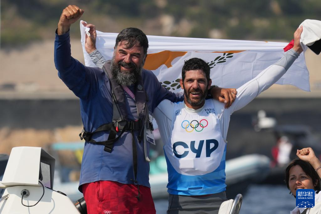 8月7日,塞浦路斯选手康蒂德斯(右)在奖牌轮后与教练庆祝。