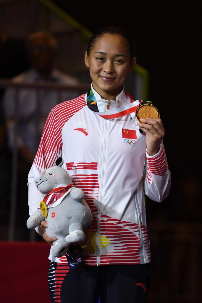 2018年9月1日,中国选手常园在颁奖仪式上。当日,在第18届亚运会拳击女子51公斤级决赛中,中国选手常园获得冠军。新华社记者 潘昱龙 摄