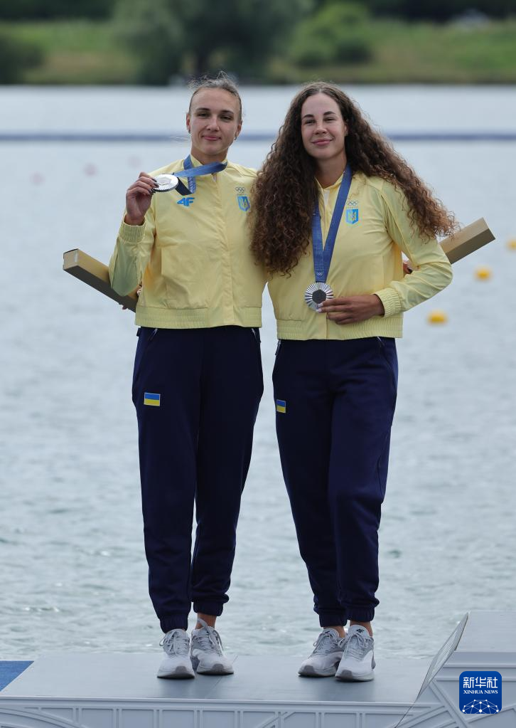 8月9日,亚军乌克兰组合柳德米拉·卢然(右)/阿纳斯塔西娅·切特维里科娃在颁奖仪式上。新华社记者 沈伯韩 摄
