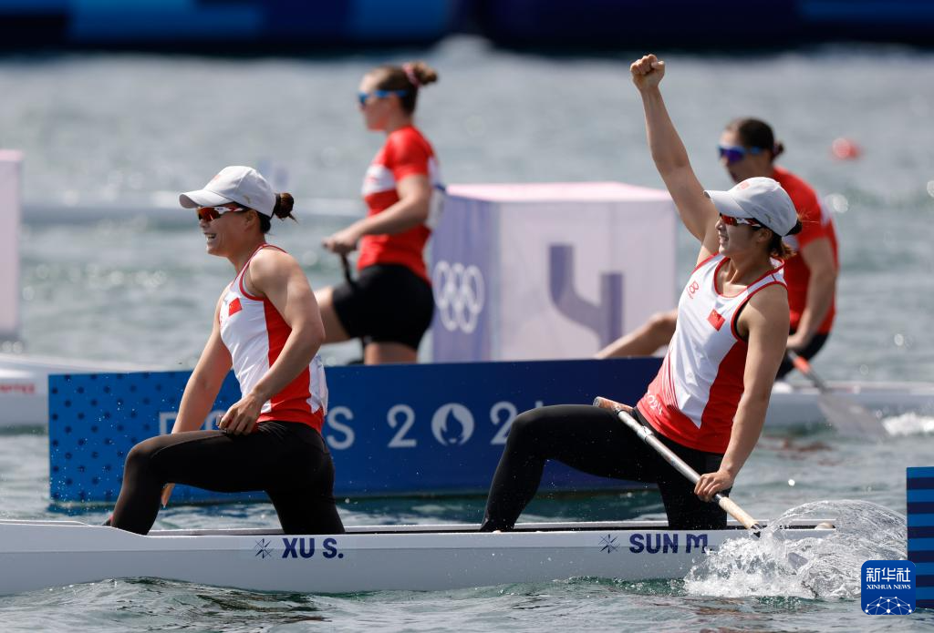 8月9日,中国组合徐诗晓(前左)/孙梦雅(前右)在冲线后庆祝。新华社记者 沈伯韩 摄