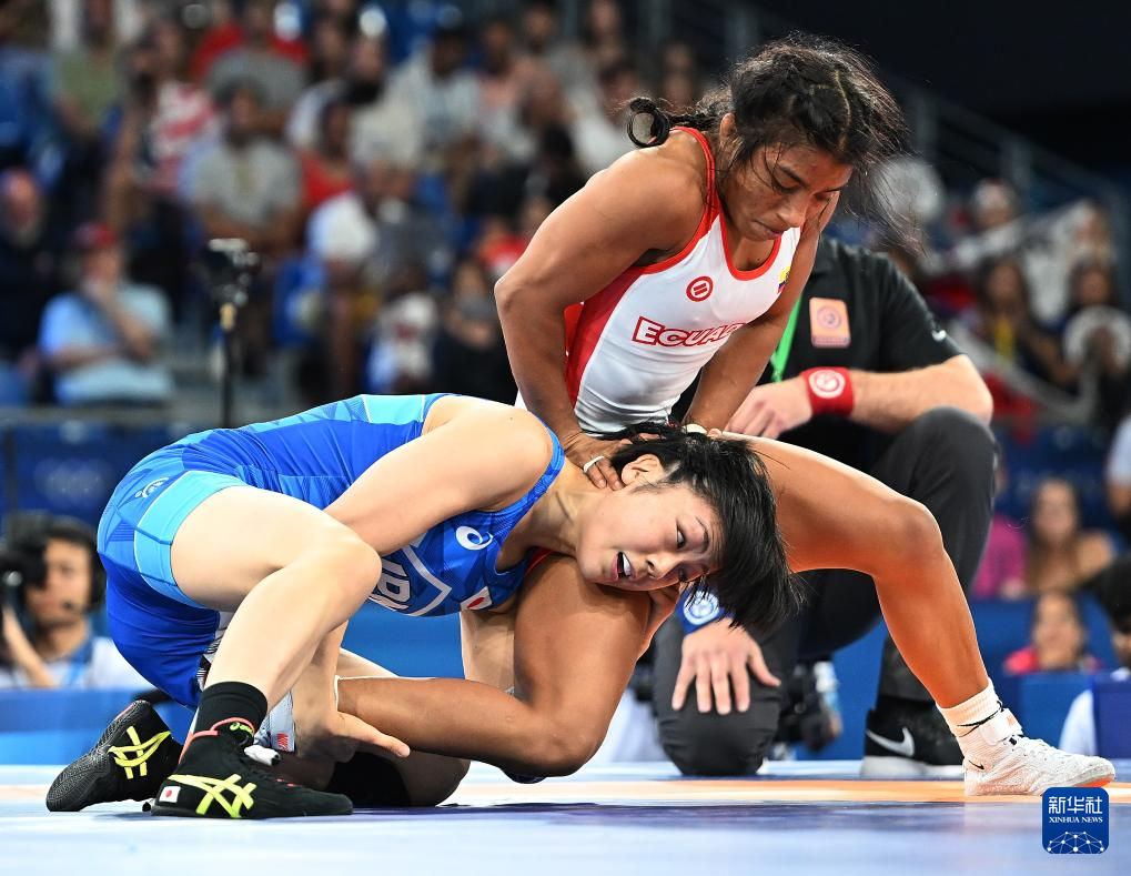 8月8日,日本选手藤波朱理(左)和厄瓜多尔选手耶佩斯·古兹曼在比赛中。最终藤波朱理夺冠。新华社记者 武巍 摄