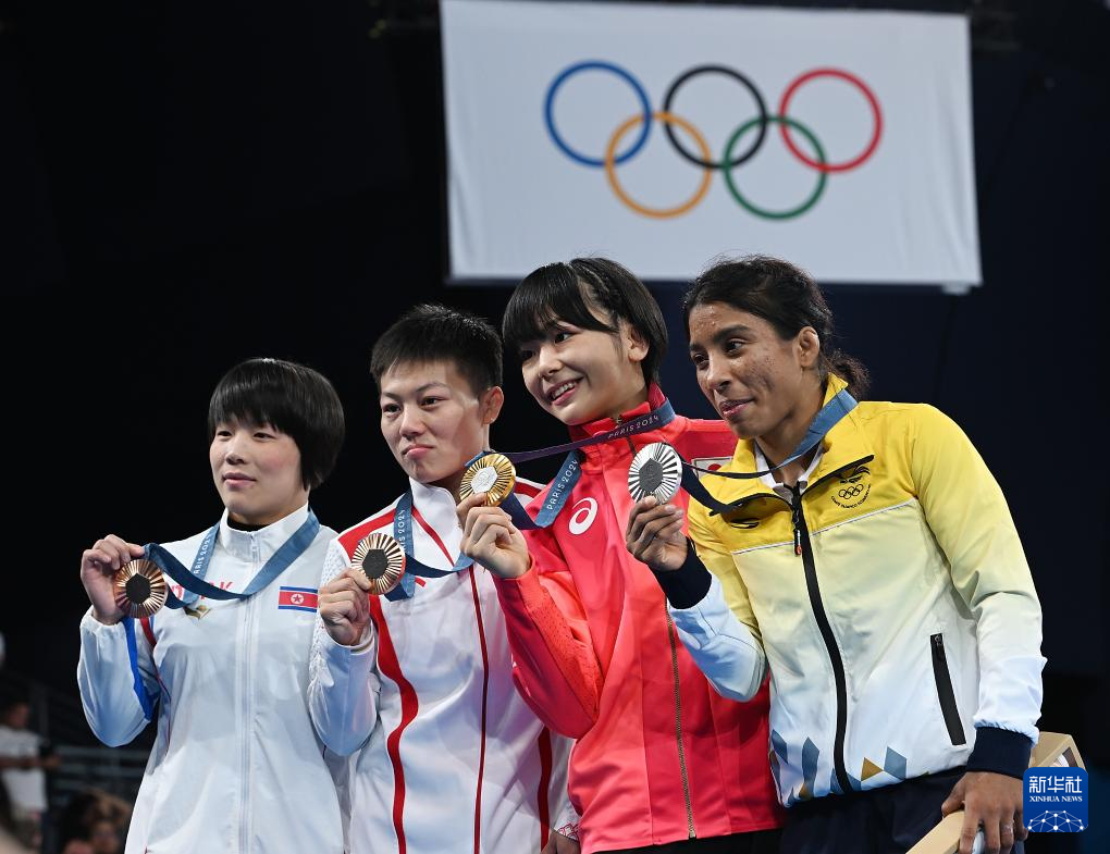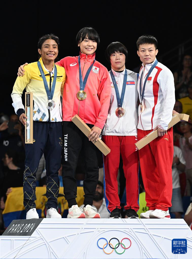 8月8日,冠军日本选手藤波朱理(左二)、亚军厄瓜多尔选手耶佩斯·古兹曼(左一)和季军中国选手庞倩玉(右一)、朝鲜选手崔孝京在颁奖仪式上合影。新华社记者 武巍 摄