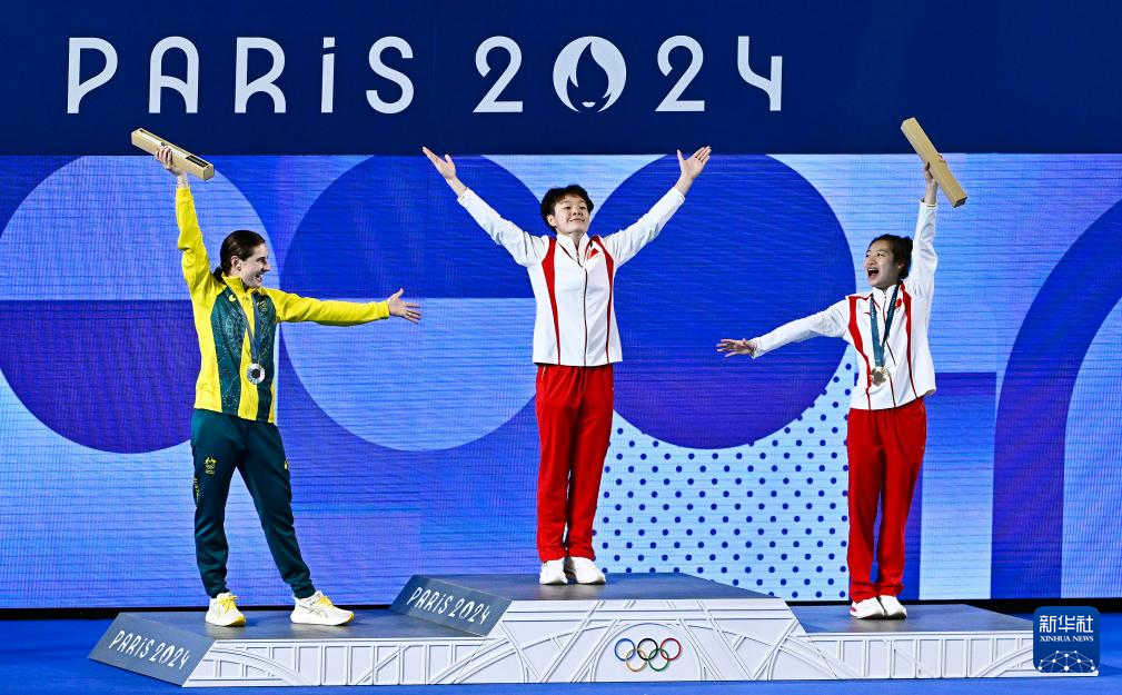 8月9日,冠军中国选手陈艺文(中)、亚军澳大利亚选手基尼(左)、季军中国选手昌雅妮在颁奖仪式上。新华社记者 张玉薇 摄