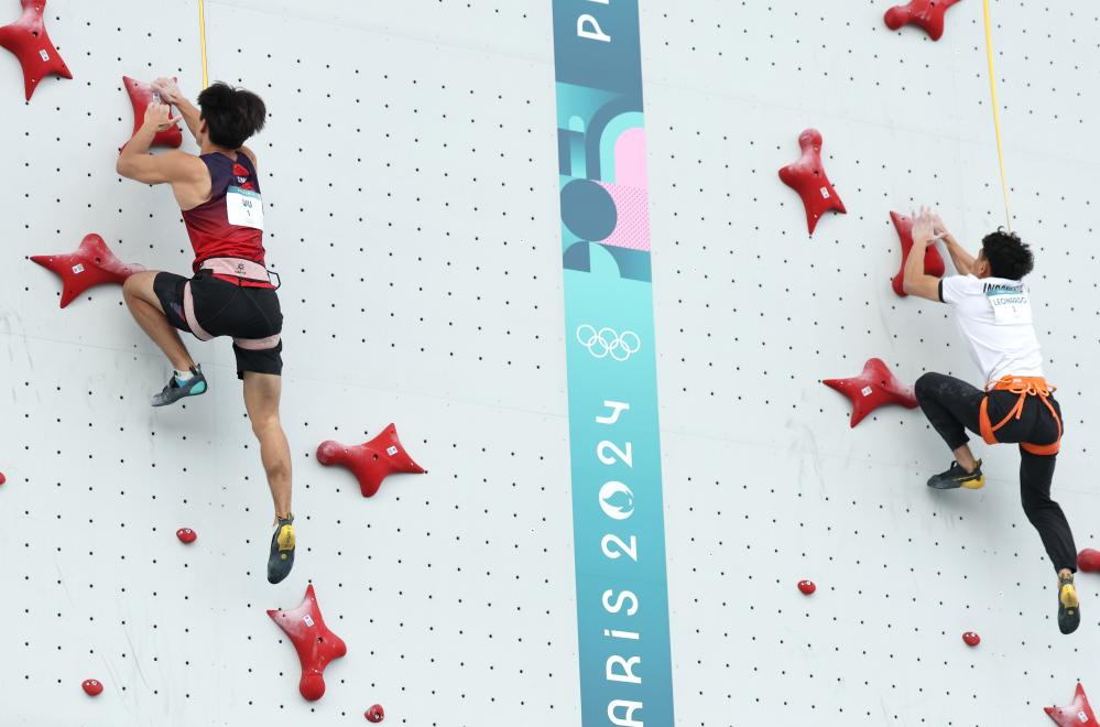 8月6日,伍鹏在男子速度攀岩资格赛中。新华社记者 高静 摄