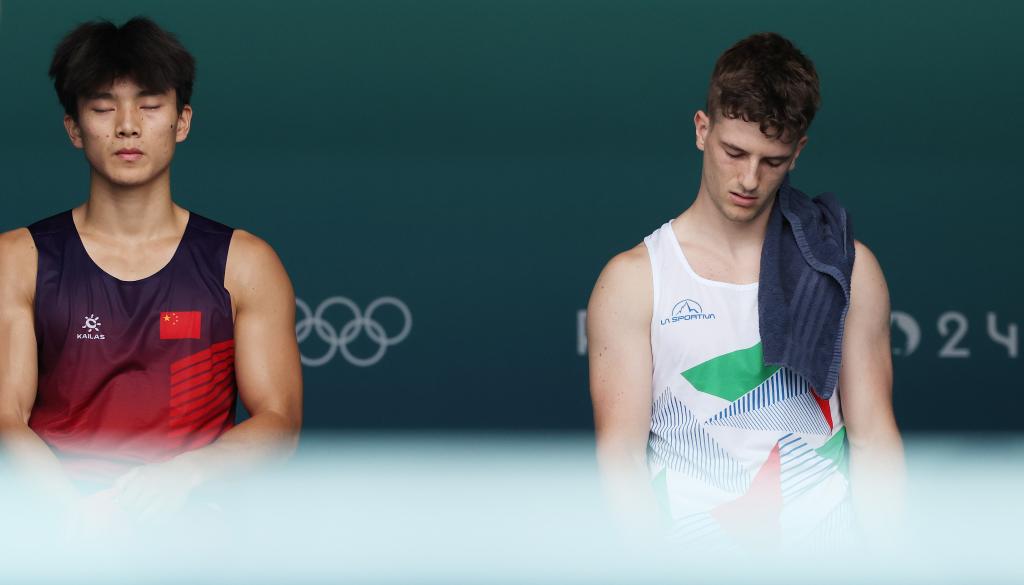 8月8日,中国选手伍鹏在巴黎奥运会男子速度攀岩决赛开始前。新华社记者 高静 摄