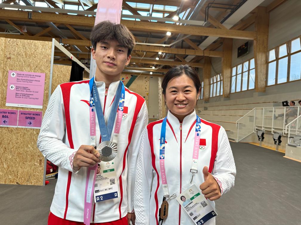 8月8日,伍鹏和主管教练张艳丽在颁奖仪式后合影