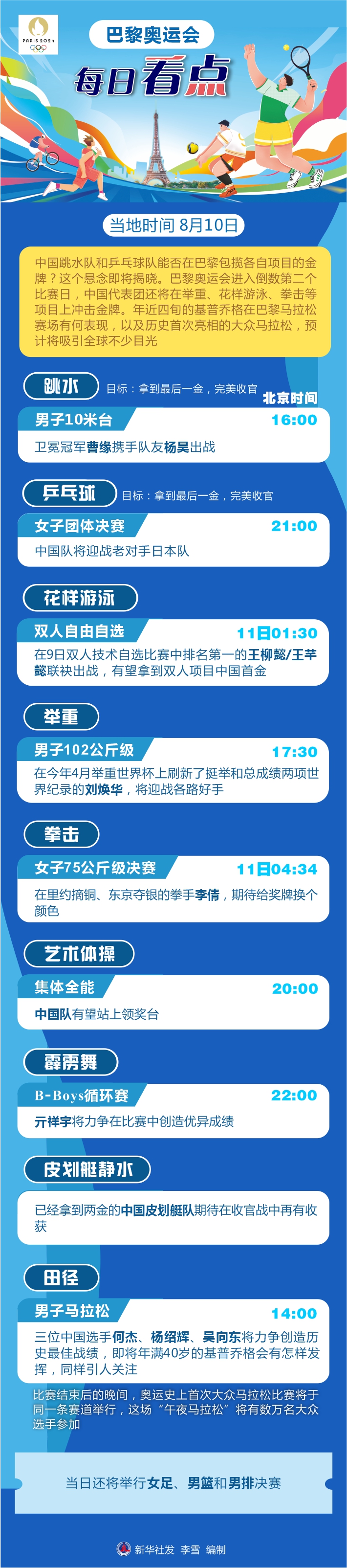 新华社巴黎8月9日电(记者王恒志、张泽伟)中国跳水队和乒乓球队能否在巴黎包揽各自项目的金牌?这个悬念将于10日揭晓。巴黎奥运会进入倒数第二个比赛日,中国代表团还将在举重、花样游泳、拳击等项目上冲击金牌。年近四旬的基普乔格在巴黎马拉松赛场有何表现,以及历史首次亮相的大众马拉松,预计将吸引全球不少目光。