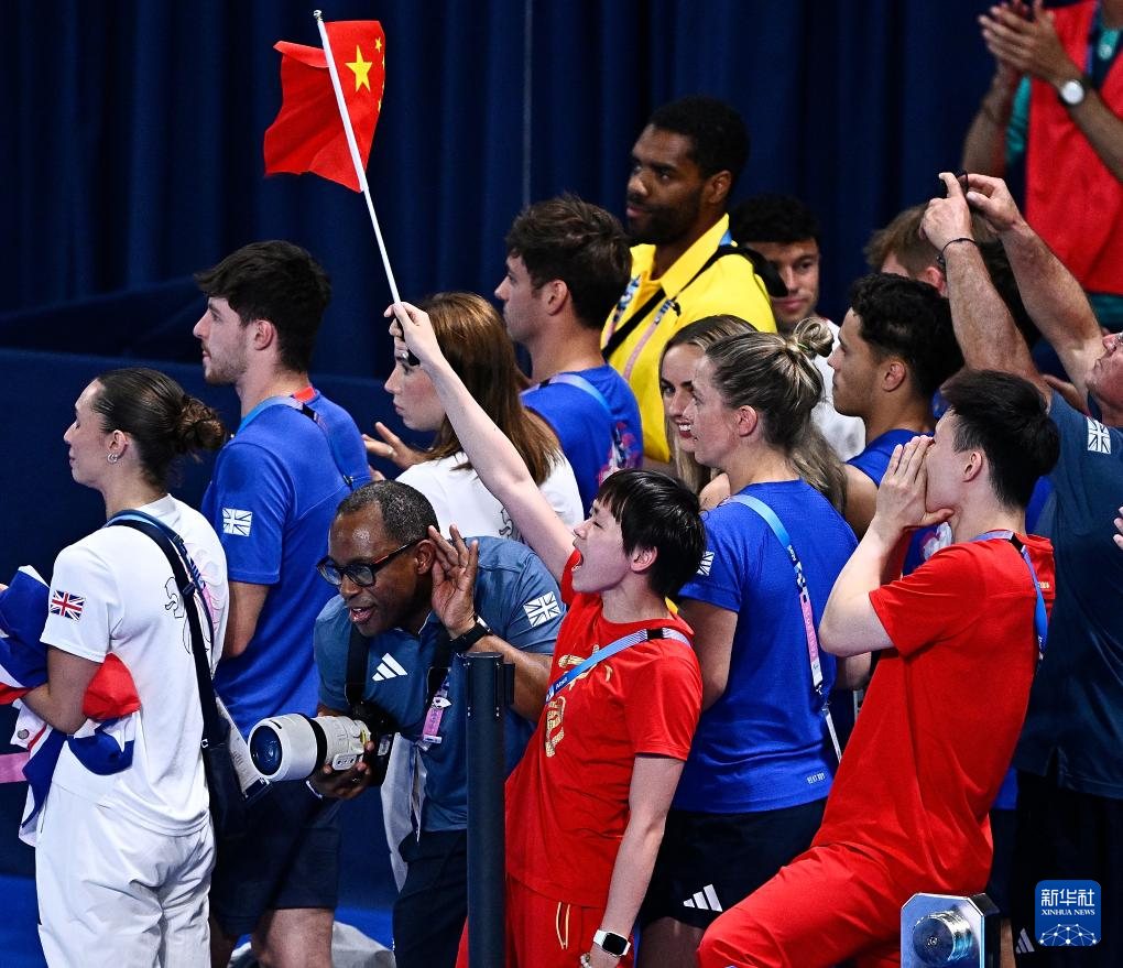 8月10日,巴黎奥运会女子10米跳台冠军全红婵(中)现场为队友加油助威。